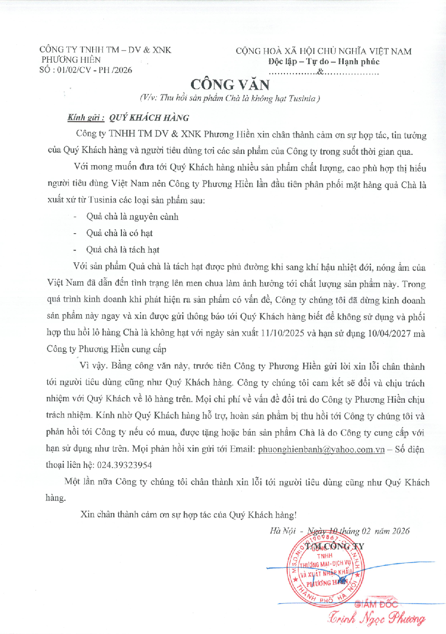 Công ty TNHH TM DV & XNK Phương Hiền nhận được phản ánh từ khách hàng về sản phẩm chà là TÁCH HẠT xuất xứ Tusinia có ngày sản xuất 11/10/2025 và hạn sử dụng 10/04/2027 do Công ty cung cấp có vị chua lên men ảnh hưởng tới chất lượng của sản phẩm, dẫn đến sự không hài lòng khách hàng. Phương Hiền muốn dành một lời xin lỗi chân thành tới tất cả Quý khách hàng đã luôn tin tưởng và đồng hành cùng Công ty.
