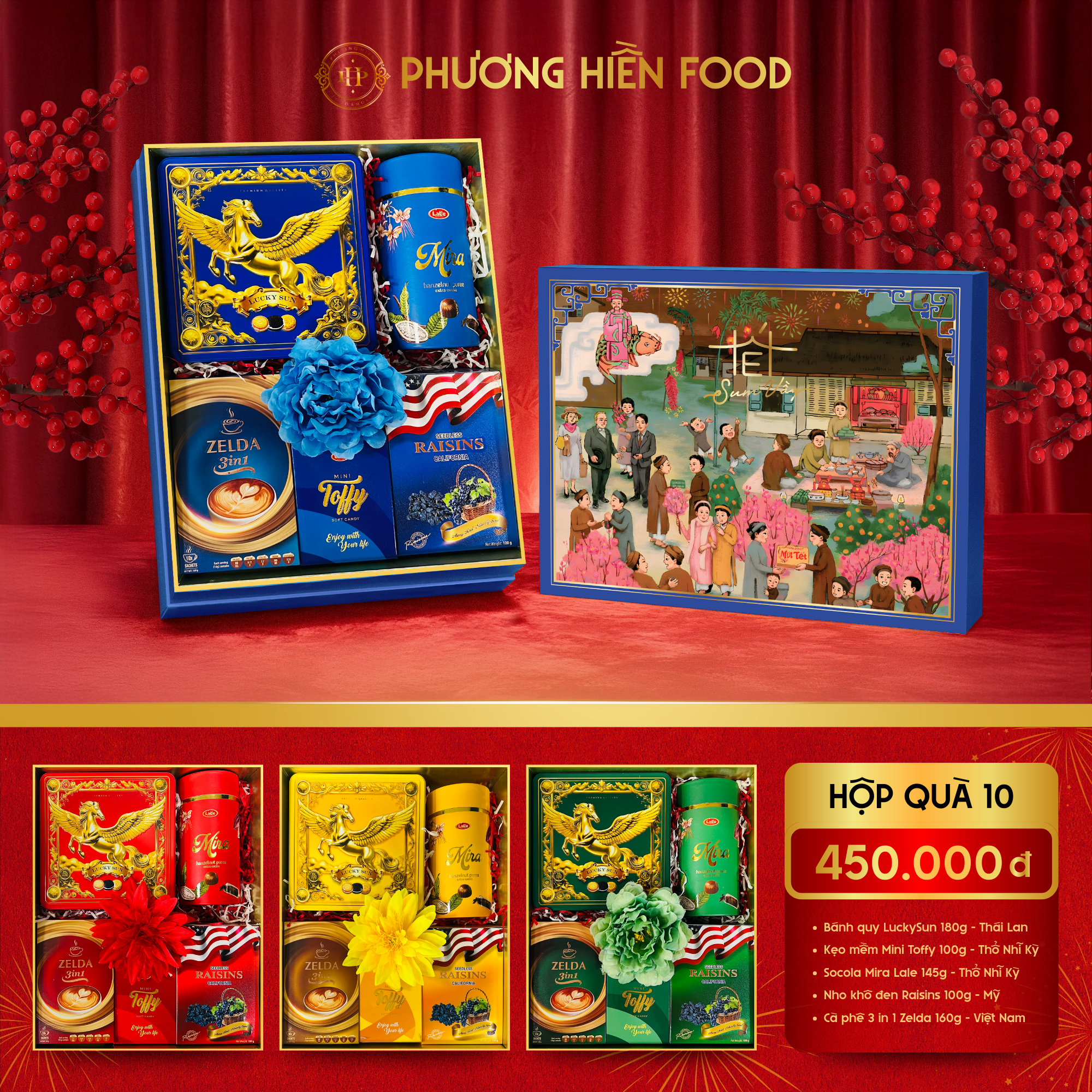 Hộp quà Tết H10 Phương Hiền Food là lựa chọn lý tưởng để biếu tặng người thân, đối tác, khách hàng dịp Tết Nguyên Đán. Thiết kế hộp sang trọng với gam màu đỏ – xanh – vàng nổi bật, họa tiết truyền thống đậm không khí xuân, thể hiện sự may mắn – thịnh vượng – sum vầy.