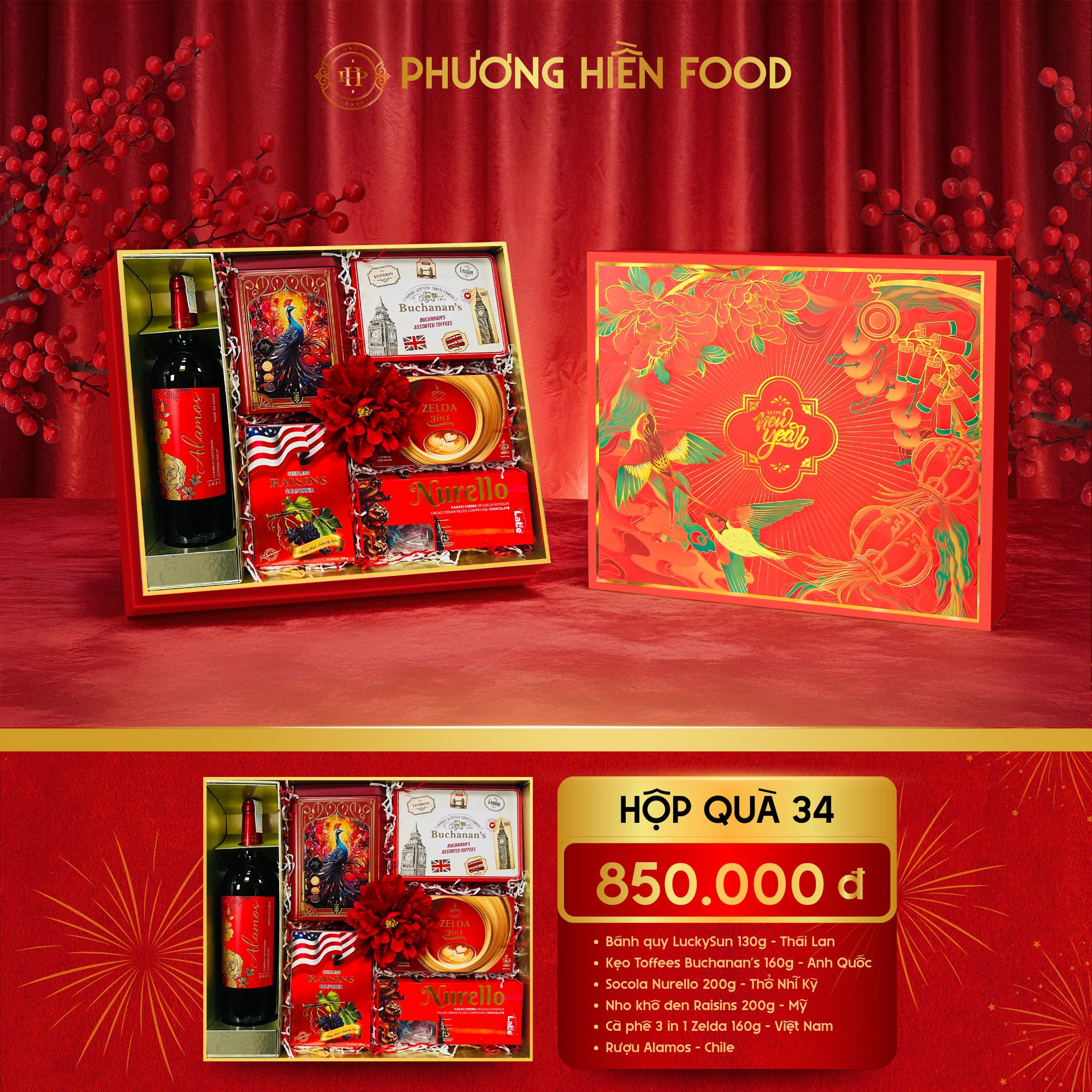 Hộp Quà 34 Phương Hiền Food là sự kết hợp hài hòa giữa rượu vang Chile, bánh kẹo nhập khẩu cao cấp và cà phê Việt, mang thông điệp an khang – phú quý – sung túc. Thiết kế hộp đỏ nổi bật cùng họa tiết chim én, hoa xuân và trống hội tượng trưng cho khởi đầu may mắn, rất thích hợp làm quà biếu Tết sang trọng năm 2026.