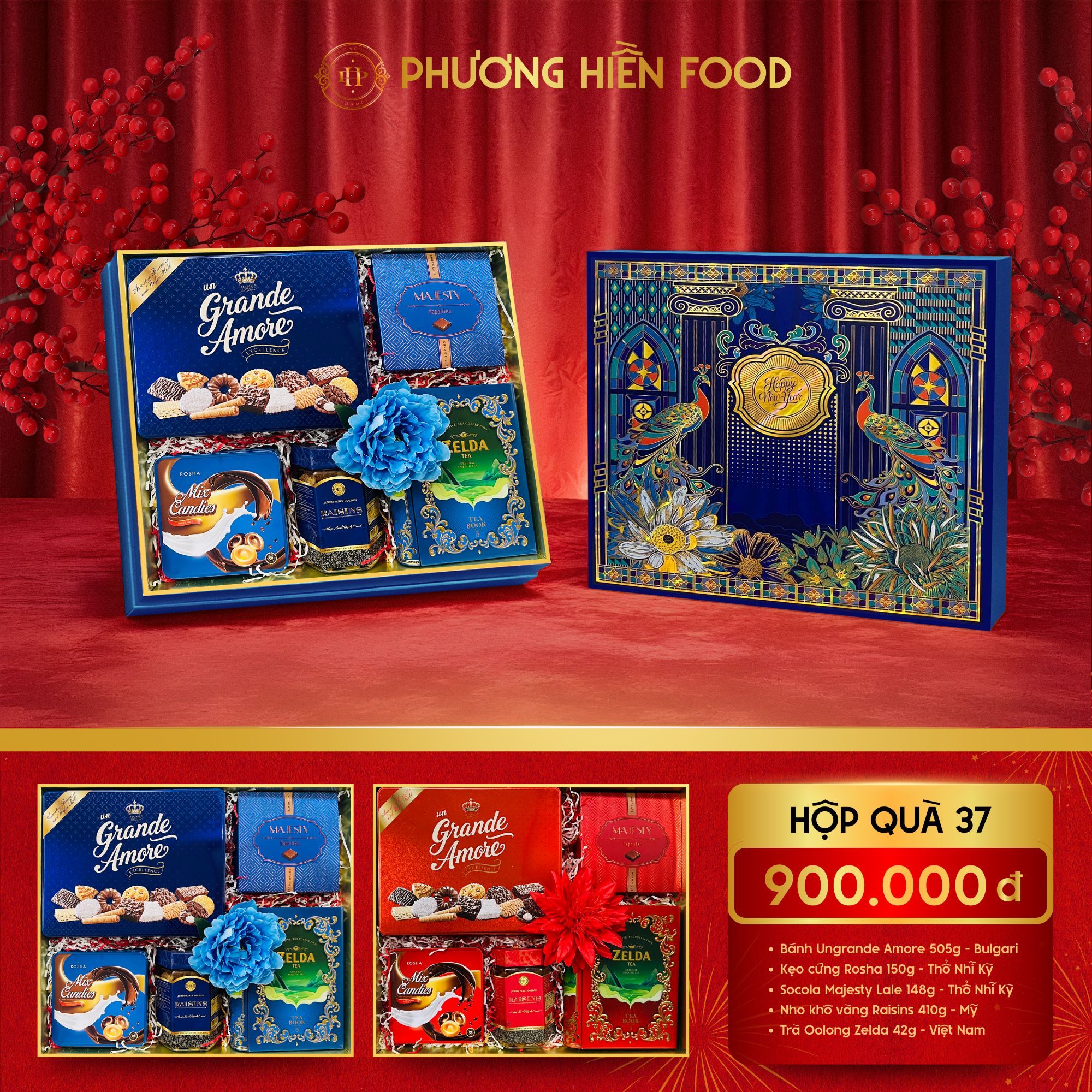 Hộp Quà 37 Phương Hiền Food là dòng quà Tết cao cấp thiên về bánh – kẹo – trà nhập khẩu, phù hợp với khách hàng yêu thích sự nhẹ nhàng, tinh tế và thanh lịch. Thiết kế hộp xanh – vàng sang trọng với họa tiết chim công, biểu trưng cho phú quý – an khang – thịnh vượng, rất thích hợp làm quà biếu Tết cho gia đình, người lớn tuổi, đối tác nữ hoặc khách hàng cao cấp dịp Tết Nguyên Đán 2026.